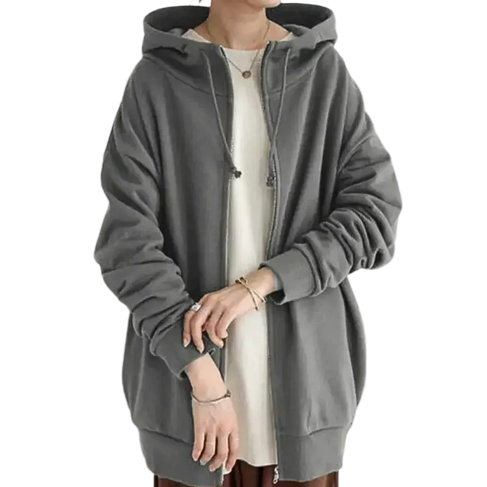 Damska bluza z kapturem zapinana na zamek, z długim kapturem, przednimi kieszeniami i kapturem ze sznurkiem.