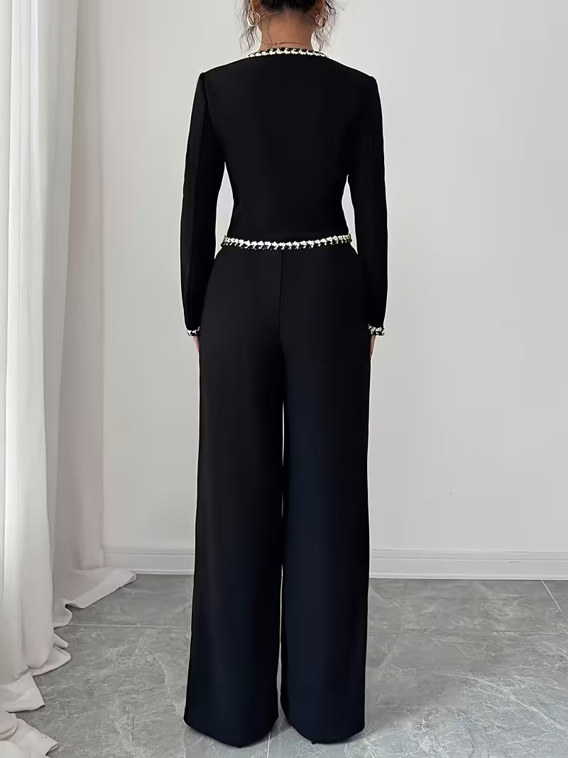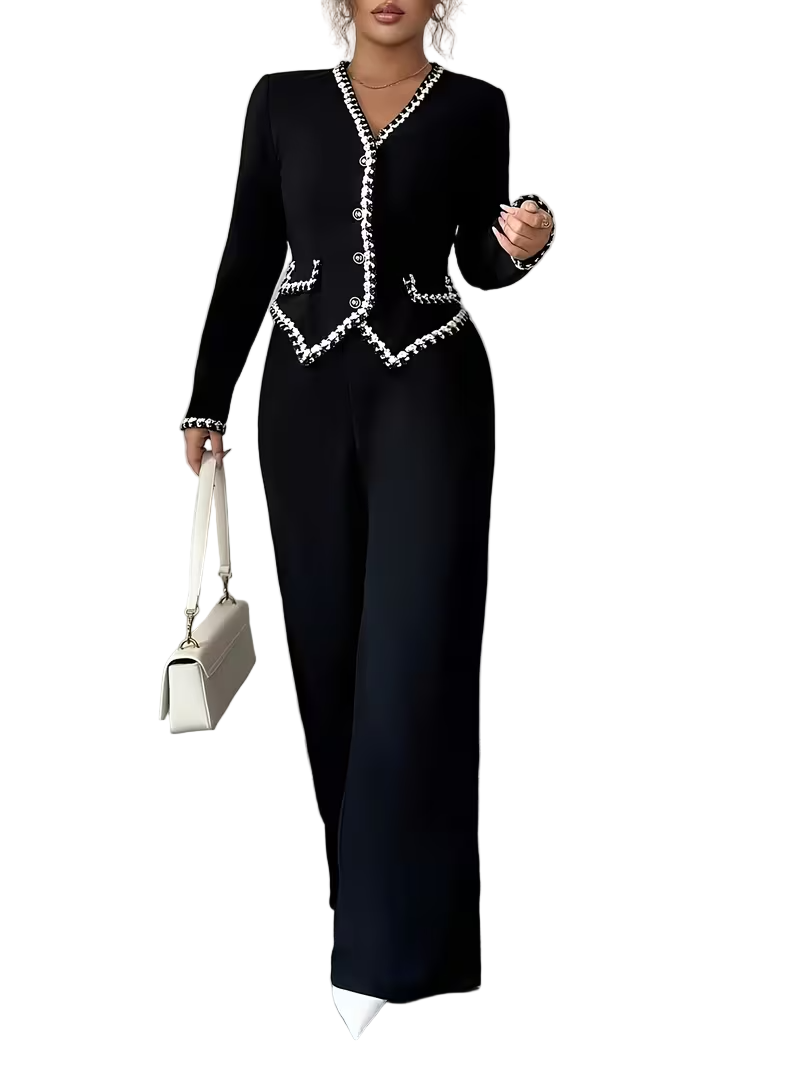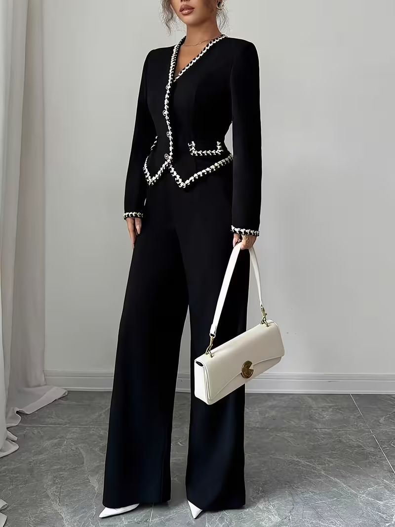 Ten damski dwuczęściowy komplet składa się z kurtki i spodni szerokich. Kurtka ma długie rękawy i dekolt w kształcie litery V. Posiada kontrastowe wykończenie na krawędziach dekoltu, przedniego otwarcia, talii oraz mankietów i klapek kieszeni. Spodnie są długie i mają szerokie nogawki.