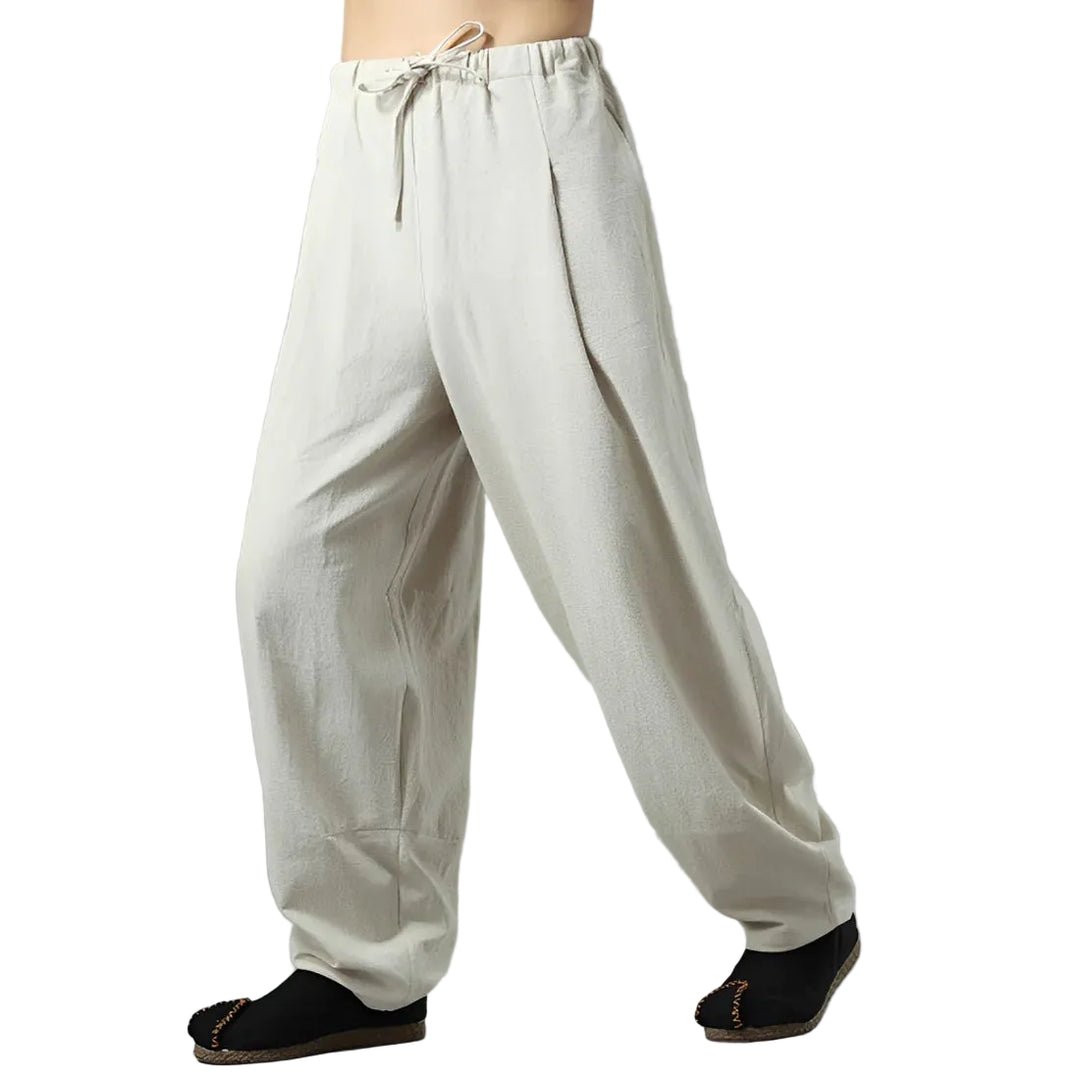 Męskie spodnie z szerokimi nogawkami, wiązaniem w pasie i kieszeniami bocznymi
