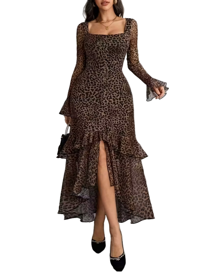 Ta damska midi sukienka z długim rękawem ma wzór w cętki na całej powierzchni sukienki. Posiada kwadratowy dekolt, który otacza górną część sukienki. Rękawy są długie i zakończone rozszerzanymi, falbanowymi mankietami. Spódnica ma wielowarstwowy, falbanowy styl, asymetryczny dół, który jest dłuższy z tyłu i krótszy z przodu, oraz wysokie rozcięcie z przodu.