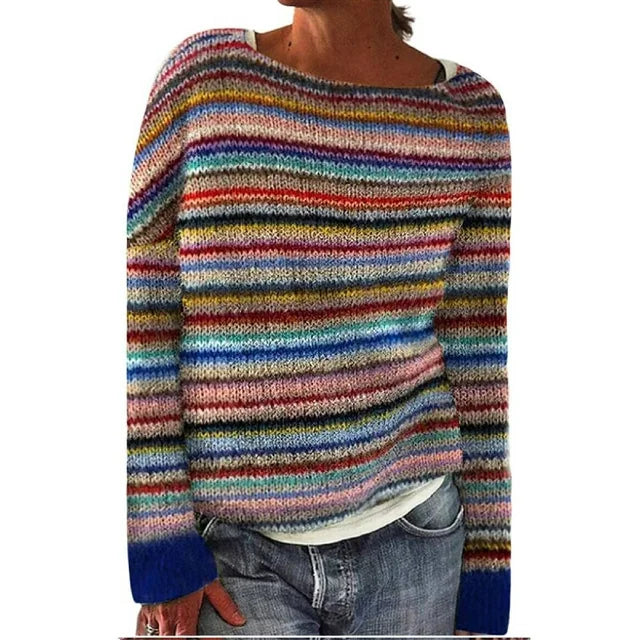Damski sweter z długim rękawem, w wielokolorowe poziome paski, z okrągłym dekoltem